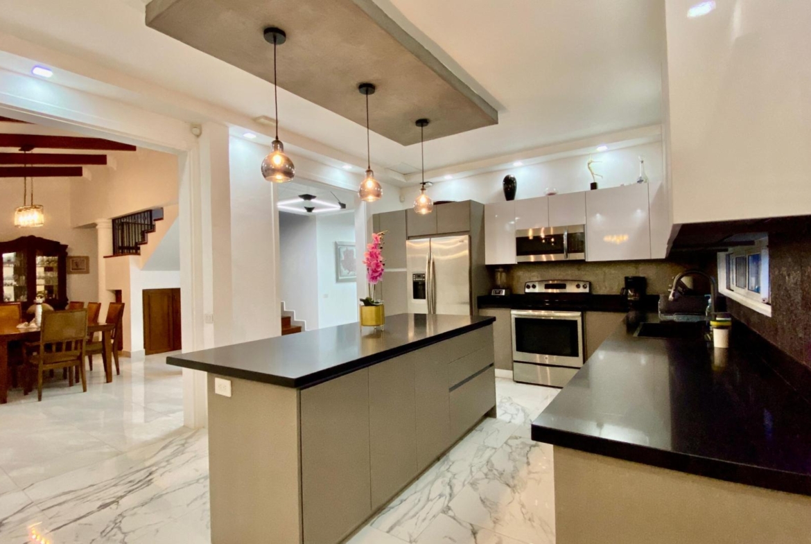 Built on a spacious 1,073 m² lot with 445 m² of construction, this fully furnished home is designed for comfort, functionality, and privacy. The residence features five bedrooms, each with its own en-suite bathroom, including two master suites located on the first and second floors, offering flexibility for families or guests. The interior layout integrates a formal living room, dining area, and a well-appointed kitchen with breakfast nook and pantry, creating a seamless flow for daily living and entertaining. Additionally, the home includes a dedicated office, a full guest bathroom, and a practical laundry area, all thoughtfully distributed to enhance everyday living.