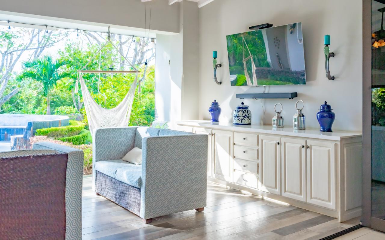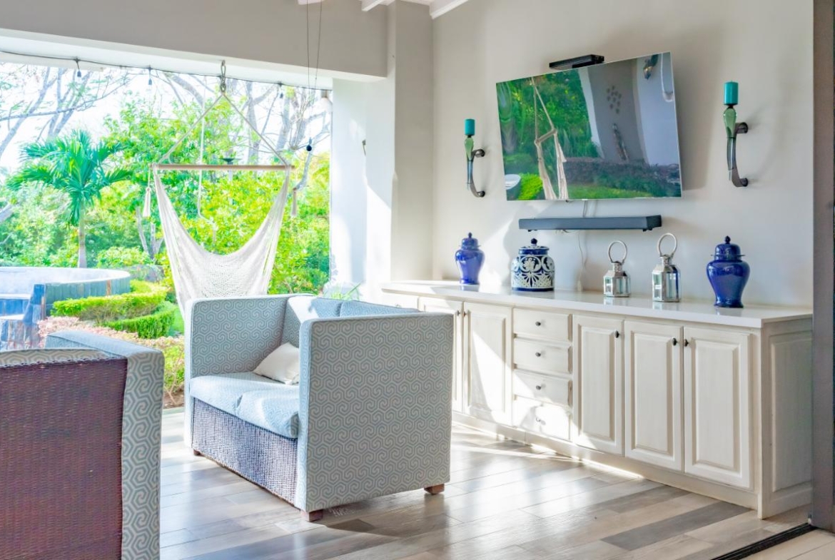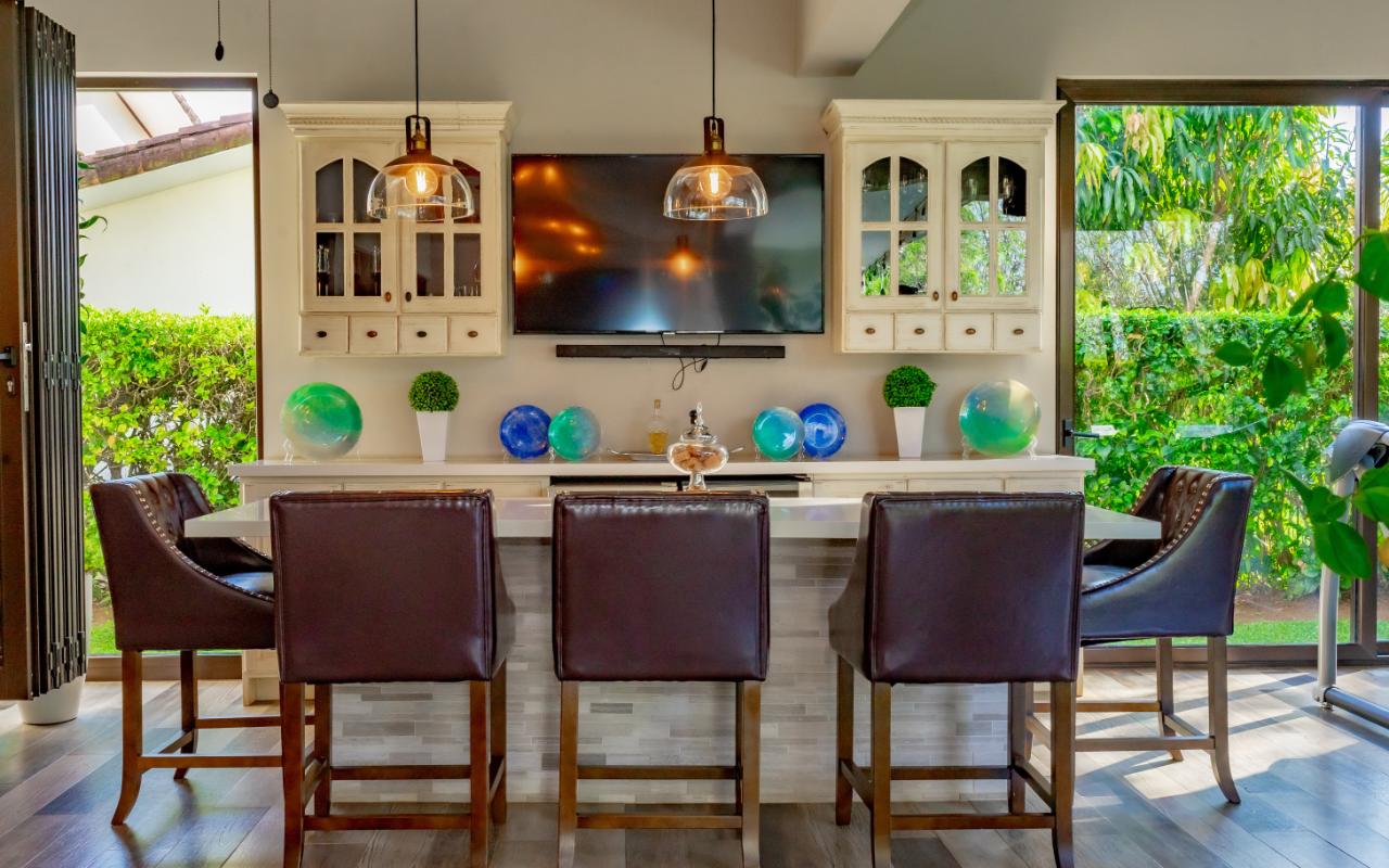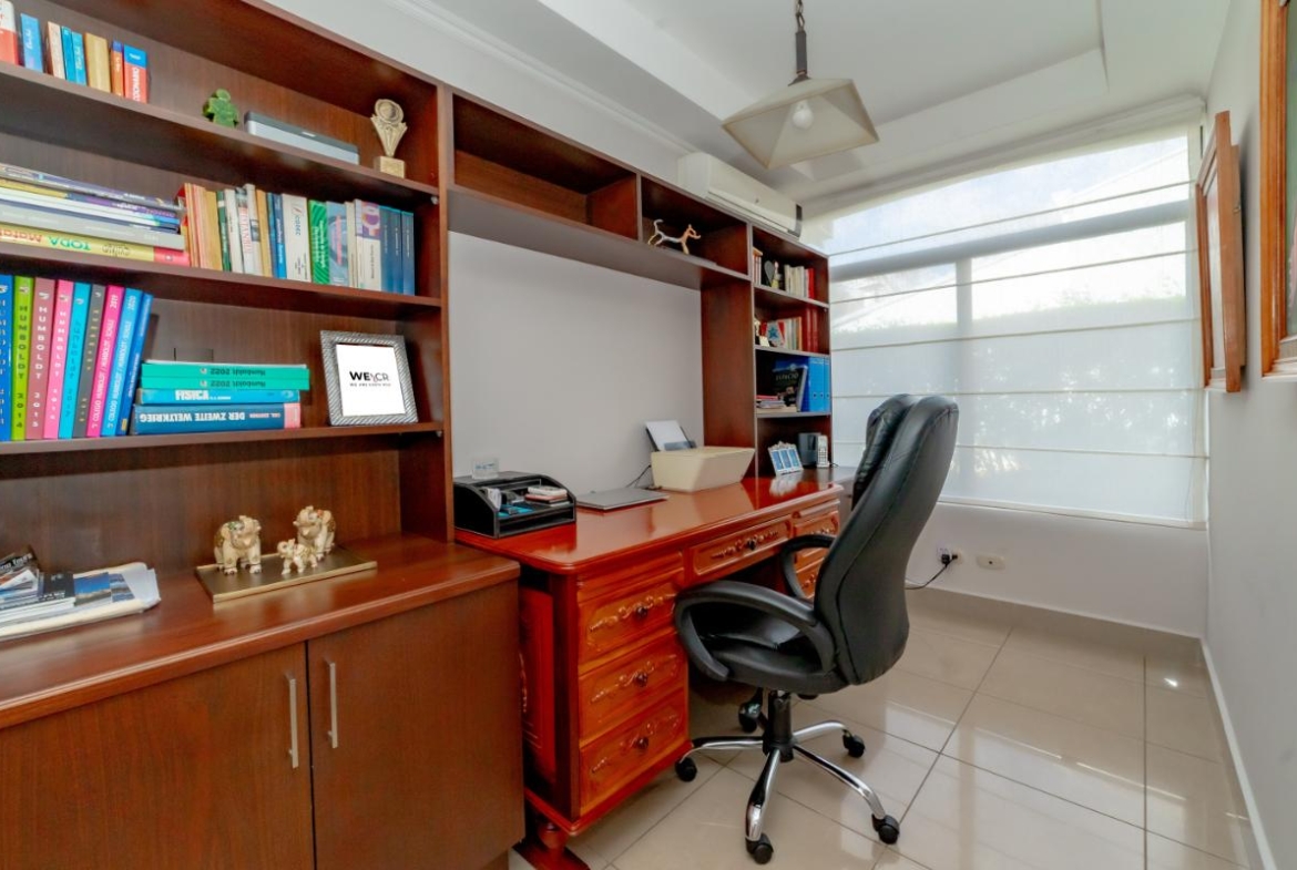 Beyond the main social areas: spacious TV room, home office, service room, two half bathrooms, fully equipped laundry room, and a large garage accommodating up to five vehicles. The private wing includes four well-sized bedrooms, each with A/C units. The master suite offers an en-suite bathroom and generous walk-in closet.