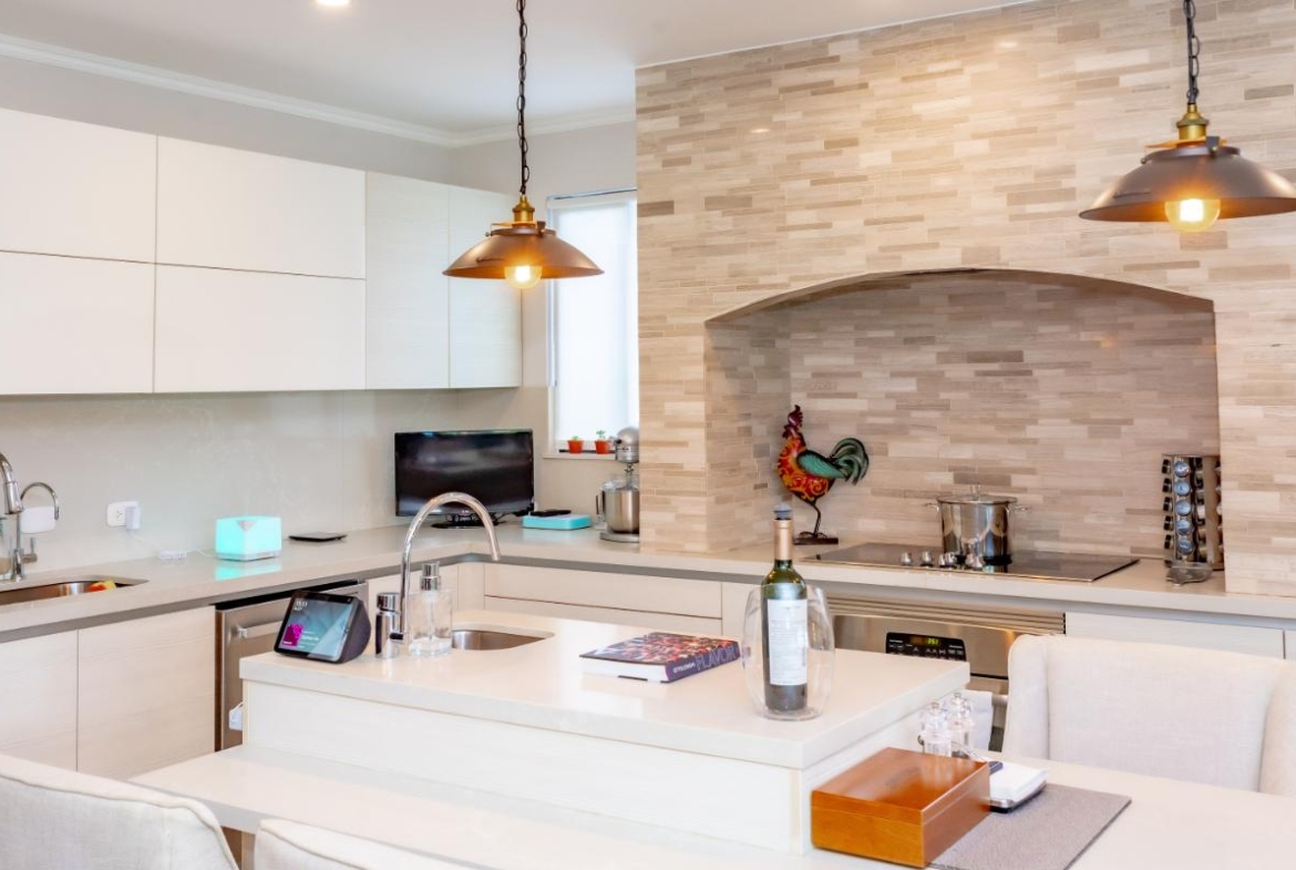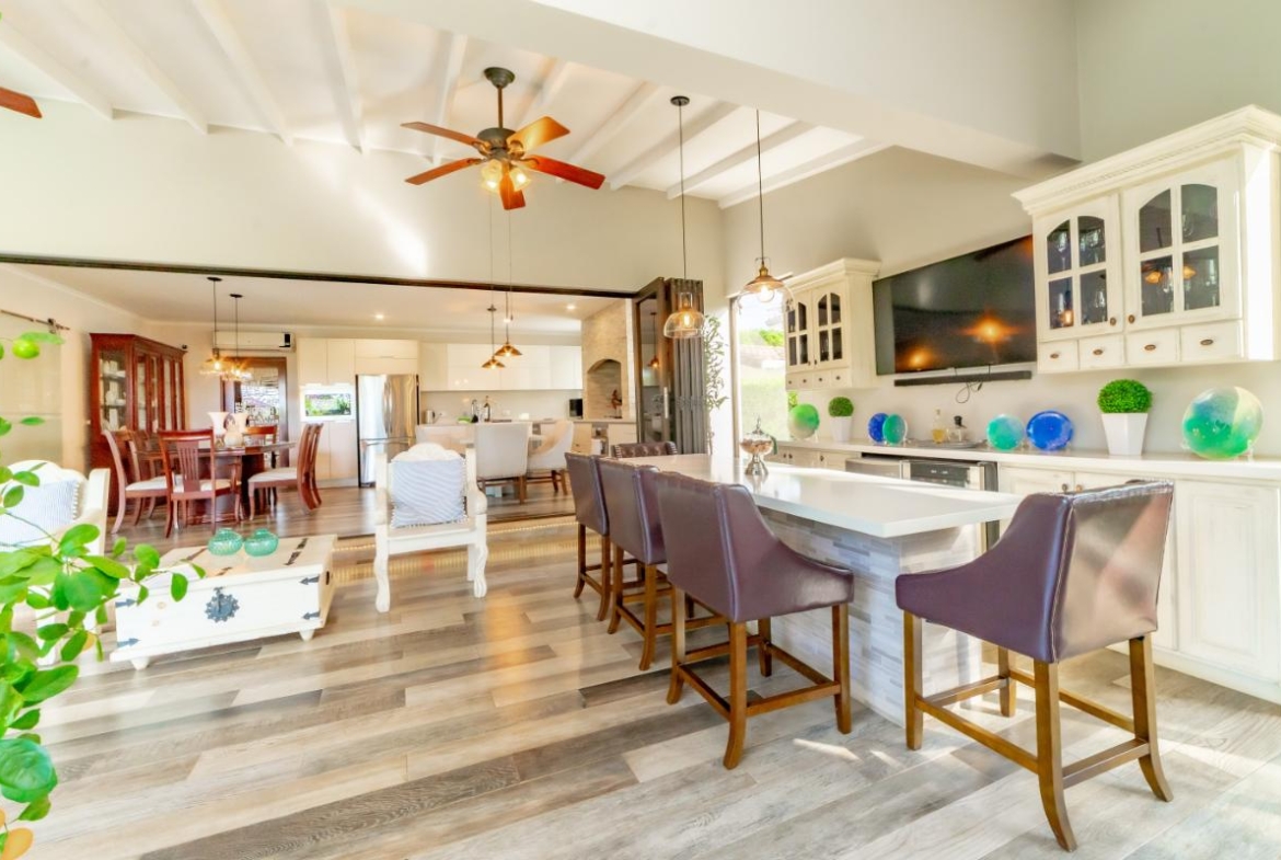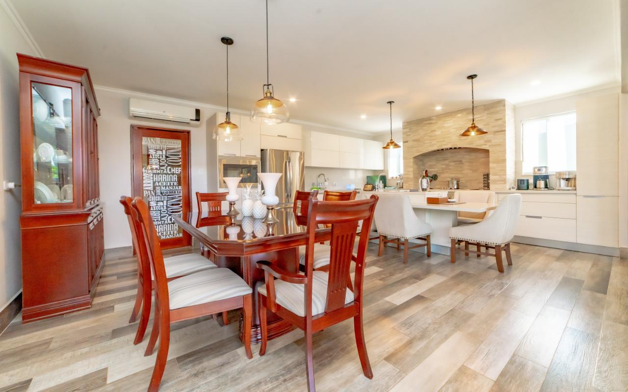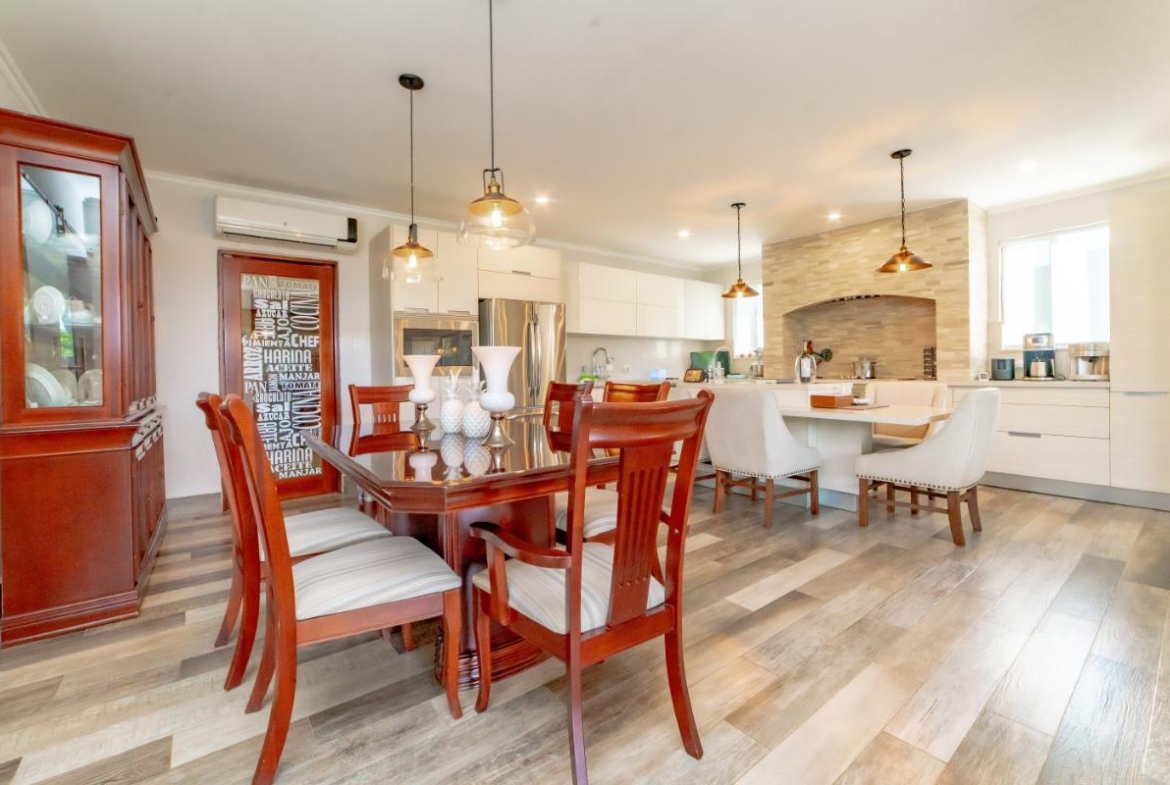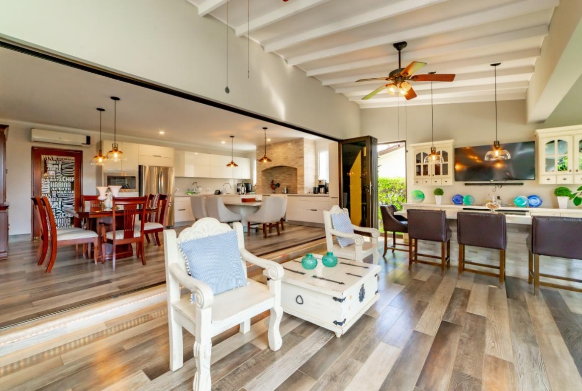 The social area features an open-concept layout with a large integrated kitchen ideal for entertaining. High ceilings, laminated floors, abundant natural light, and excellent cross-ventilation create an inviting atmosphere. Seamless connection to the covered terrace expands the entertainment area. Both front and backyard offer beautifully landscaped gardens and a charming fountain.