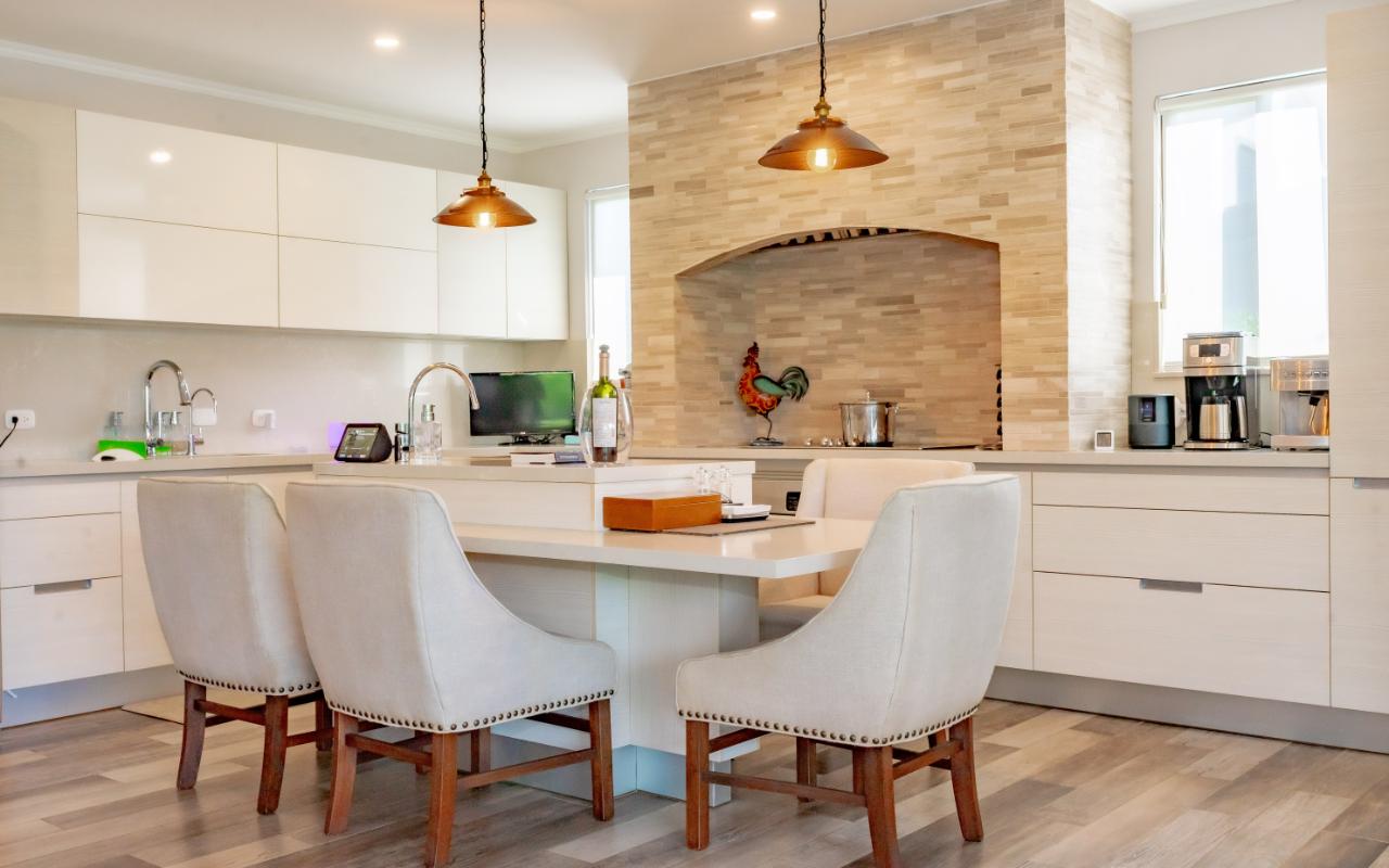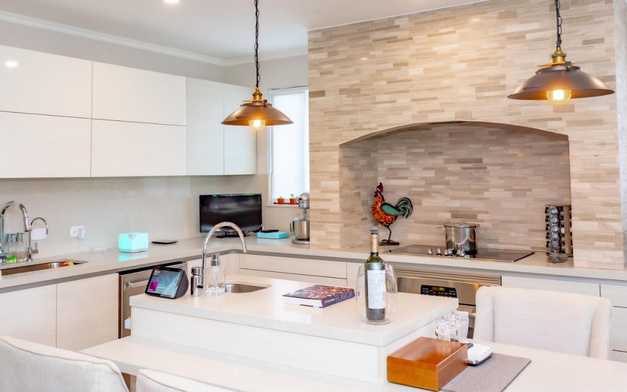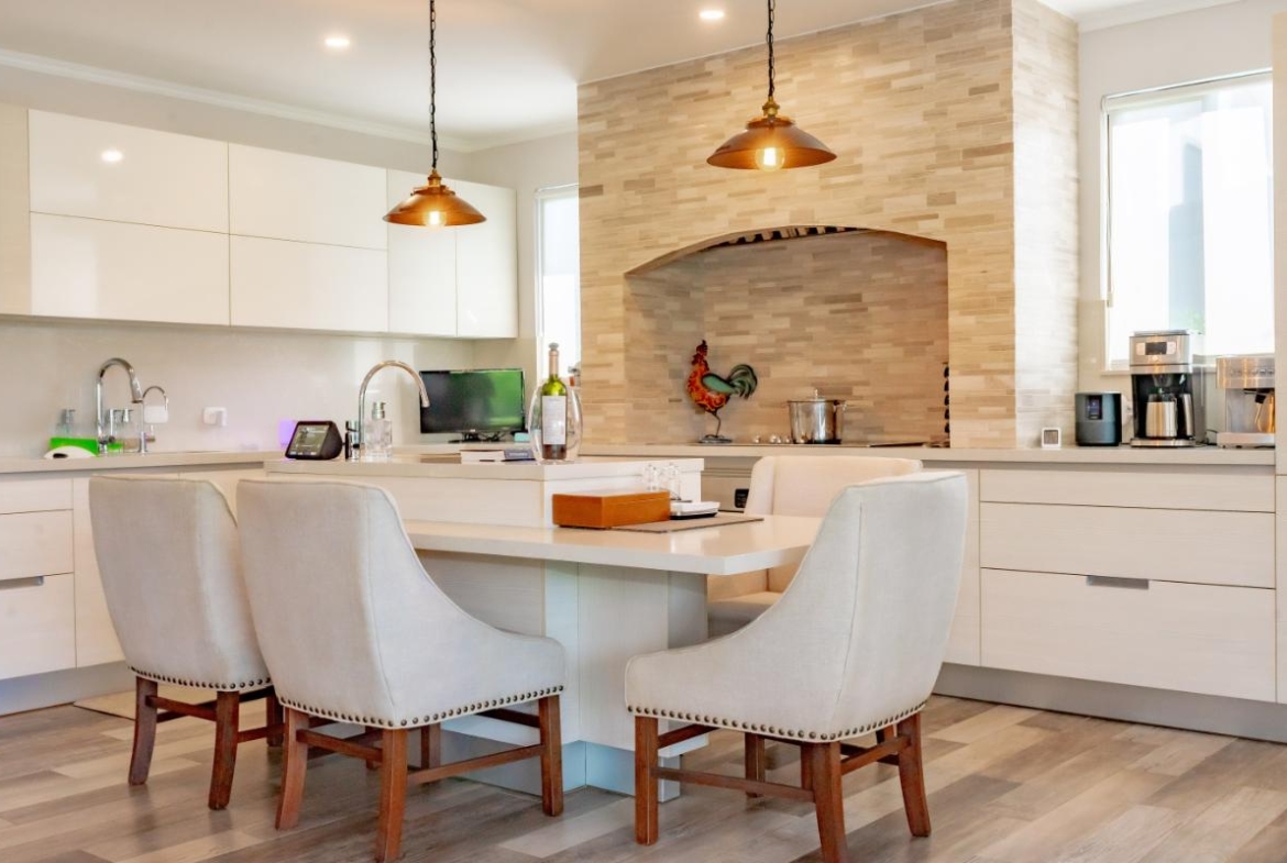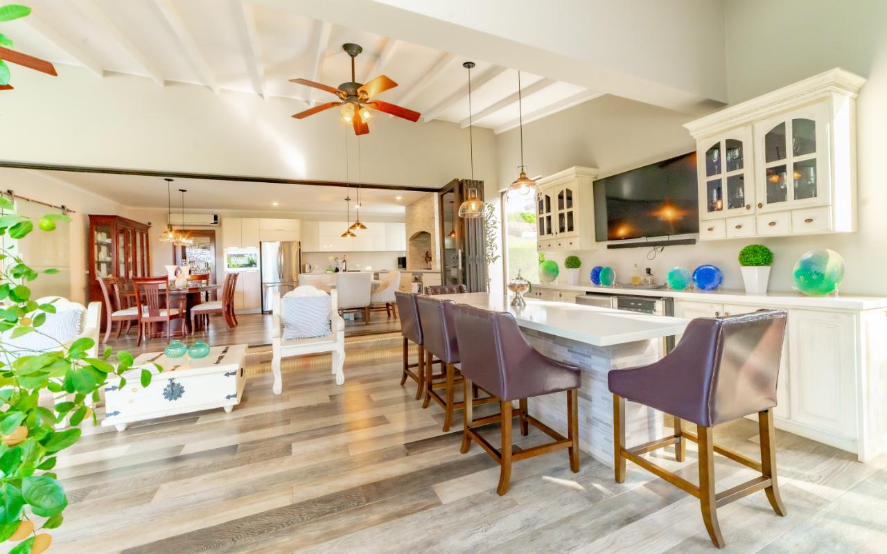 The social area features an open-concept layout with a large integrated kitchen ideal for entertaining. High ceilings, laminated floors, abundant natural light, and excellent cross-ventilation create an inviting atmosphere. Seamless connection to the covered terrace expands the entertainment area. Both front and backyard offer beautifully landscaped gardens and a charming fountain.